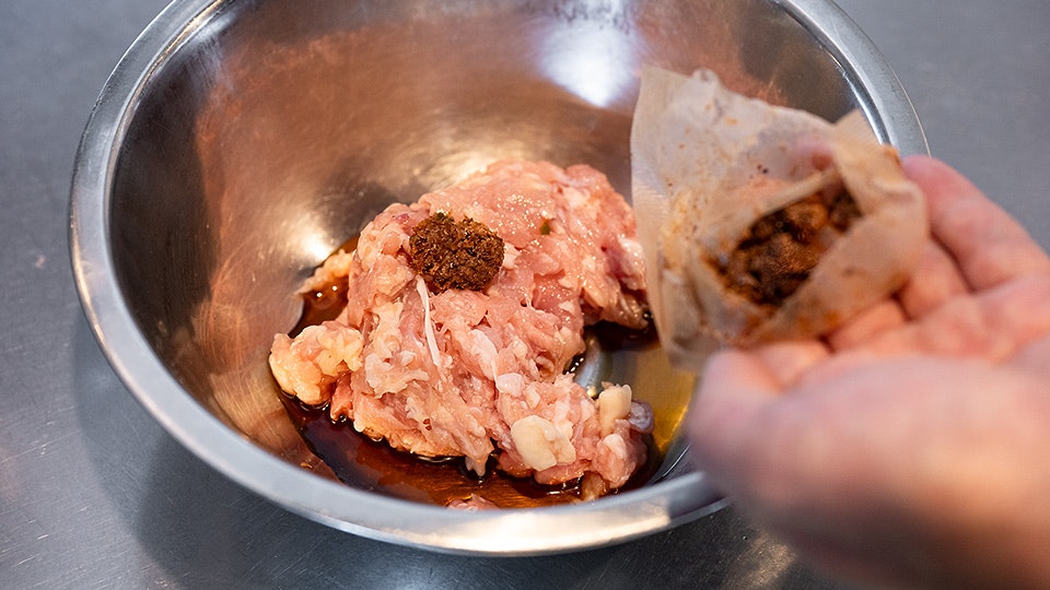 お次は、待っていました! つくね料理です。ここで登場するのが、下準備でとっておいた「だしがら」。鶏ひき肉に加えることでコク深くなります。このアイデアは他のひき肉料理にも生かせそうですね。