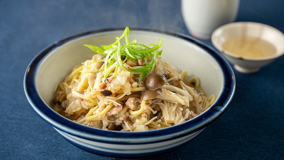 最後に締めの麺も紹介していただきました。こちらは「椎茸だし」を使って、きのこたっぷりの和え麺に。