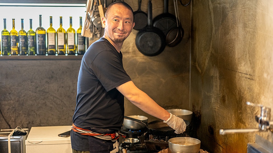 やって来たのは福岡県にある「捏(つくね)製作所」。その名の通り、旬の食材を取り入れたつくねが名物ですが、季節を問わず“燗酒推し”なのがこの店の核ともいえるところ。温めて飲む日本酒と食材、どちらのおいしさも対等に引き出す料理をつくっているのが店主の菅原淳思さん。燗つけは慶さんが担当しています。