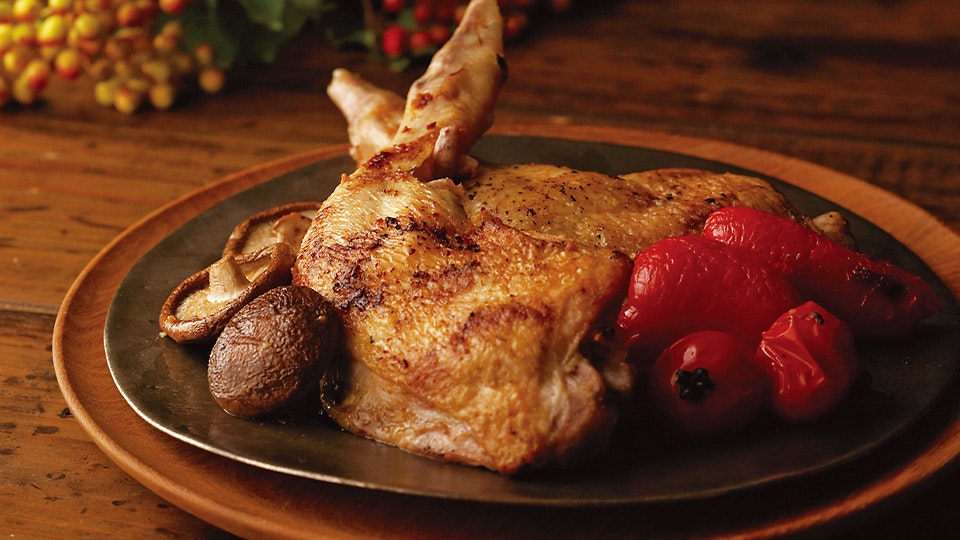 骨付きの鶏もも肉に「野菜だし」をすり込めば、玉ねぎやセロリ、にんにくなど香味野菜の風味がお肉の臭みを消して、うまみを与えてくれます。一晩じっくり寝かせて味がなじんだら、あとは焼くだけで完成。気分高まる冬の食卓の主役にどうぞ。
