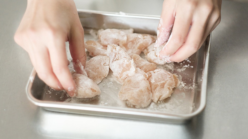 「片栗粉が多すぎるとダマになったり、ぶよぶよのかたまりができてしまうので、全体にうすくまぶす程度に」