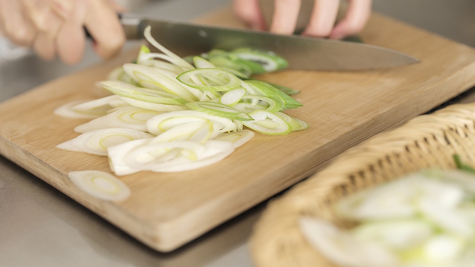 斜め薄切りに。青い部分も、細く切って使いますよ。