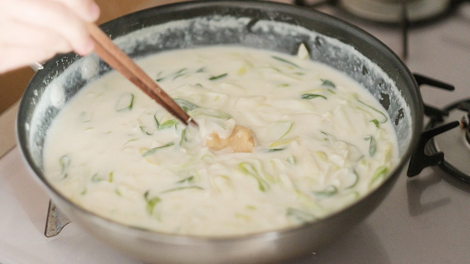 そして、白みそを投入。「ヘラではなく、箸を使うと溶きやすいですよ」と教わりました。ほほう、なるほど。