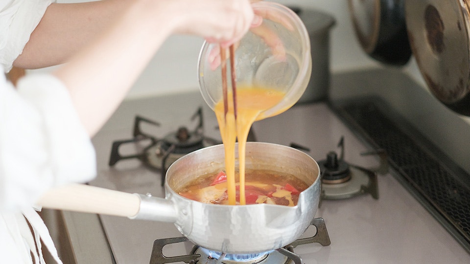 1分ほど加熱したら、ぐつぐつしているところに溶きほぐした卵をたっぷりと。