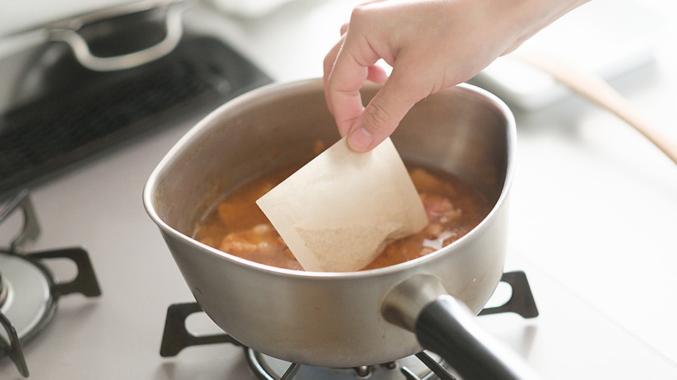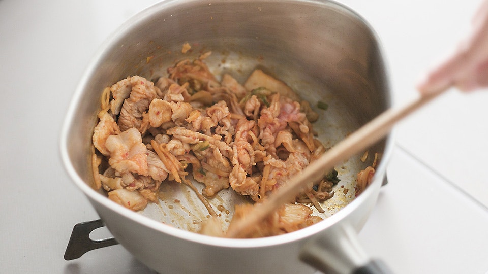 つくり方はまずキムチと豚肉、生姜をあらかじめ炒めたあと、水とだしパックを入れて煮出します。