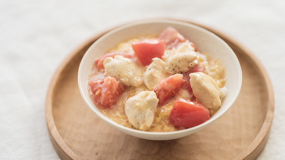 とっただしにささみ、みりんと醤油、さらに片栗粉を入れて3〜4分。ささみに火が通ったら、一口大に切ったトマトを加えて