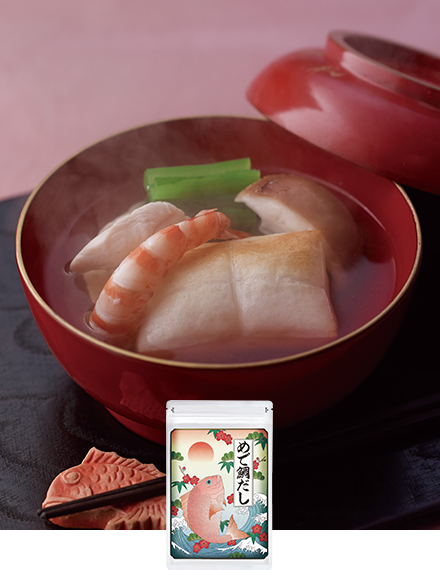 “おめでたい”の語呂から、お祝いの席や慶び事に華を添える縁起物の鯛。上品な鯛節に、あごと利尻昆布、帆立を合わせた「めで鯛だし」は、すっきりと繊細な味わいです。