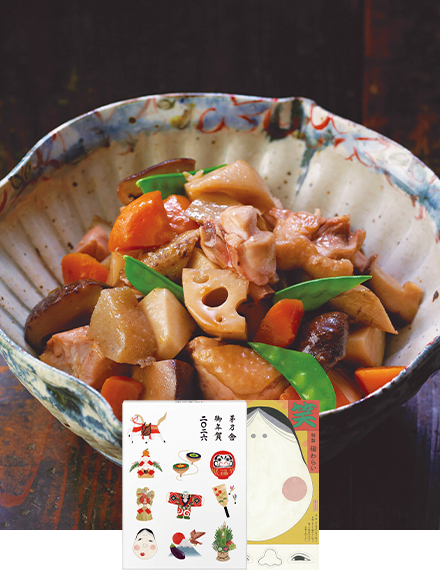 おなじみの「茅乃舎だし」を、干支(午年)の絵柄がおめでたい贈答箱に入れてお届けします。毎年ご好評いただいている「福笑い」の付録付きです。