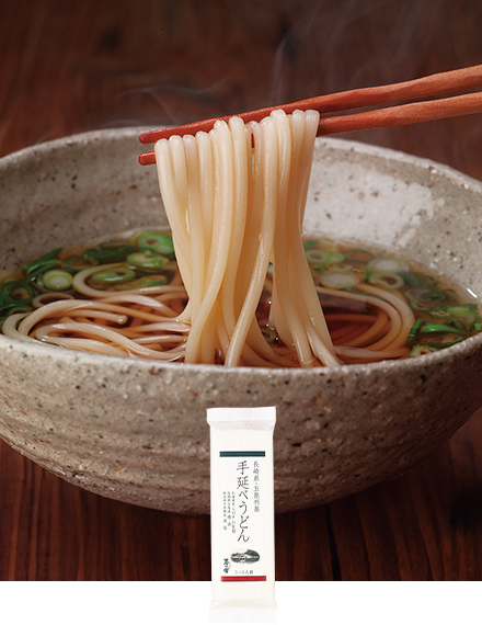 長崎県五島列島に伝わる、手延べうどん。椿油を塗りながら、ひねるように細く伸ばした麺はなめらかで、独特のコシがあります。鍋料理の〆にもおすすめです。