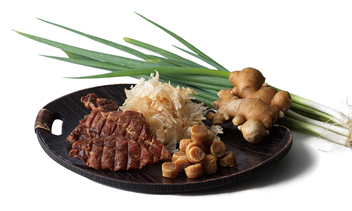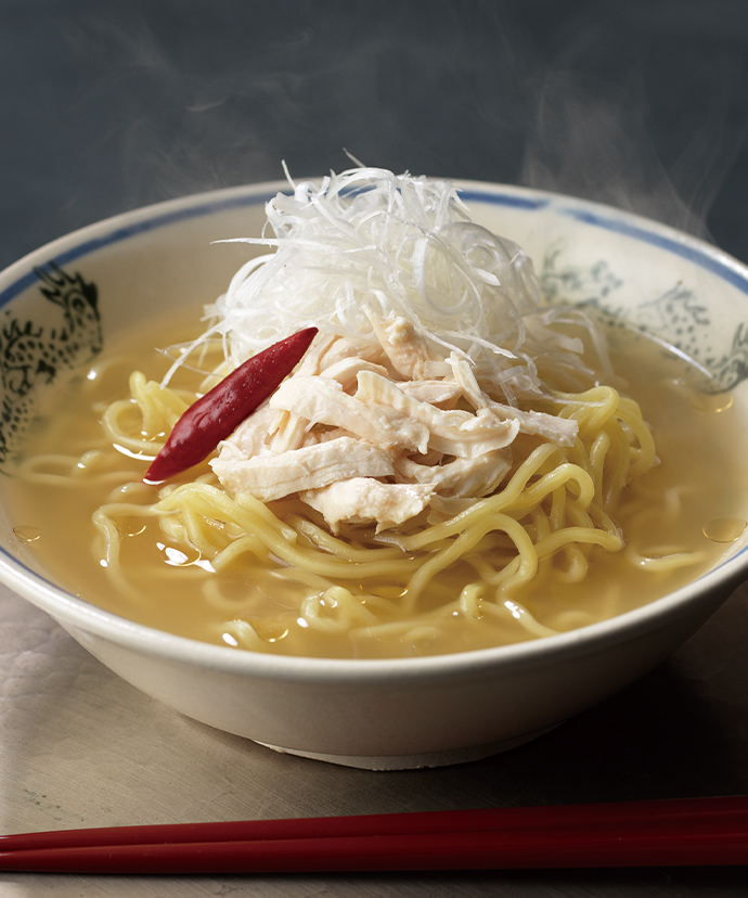 燻した国産鶏の削り節を使用。今冬リニューアルし、鶏のうまみに、ほたてを合わせ、生姜、葱の香味野菜を加えることで中華らしい味わいに仕上げています。