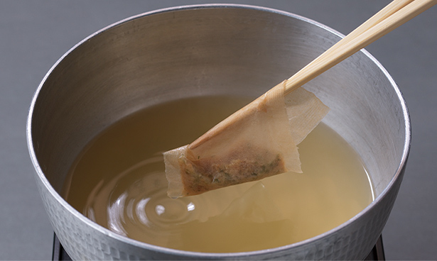 だしパックを破って、中身を出し調理します。お料理に応じて、味を調えてください。