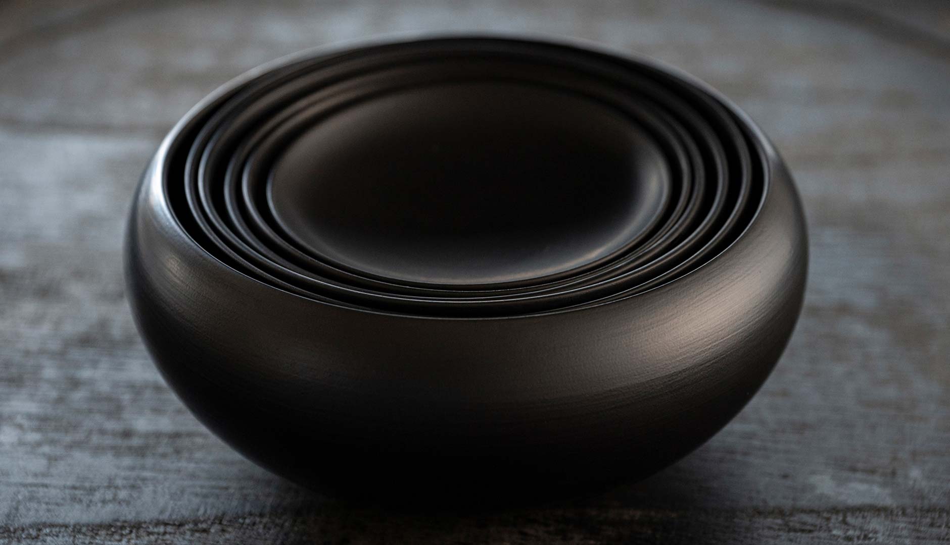 6つの器が入れ子になった「応量器」。源流にあるのは、必要なものを必要なだけ感謝とともにいただく、僧侶の食への姿勢です。現代の食卓でも使いやすい磁器でおつくりしました。墨のようにやわらかな黒色が、季節の料理の美しい背景となります。
