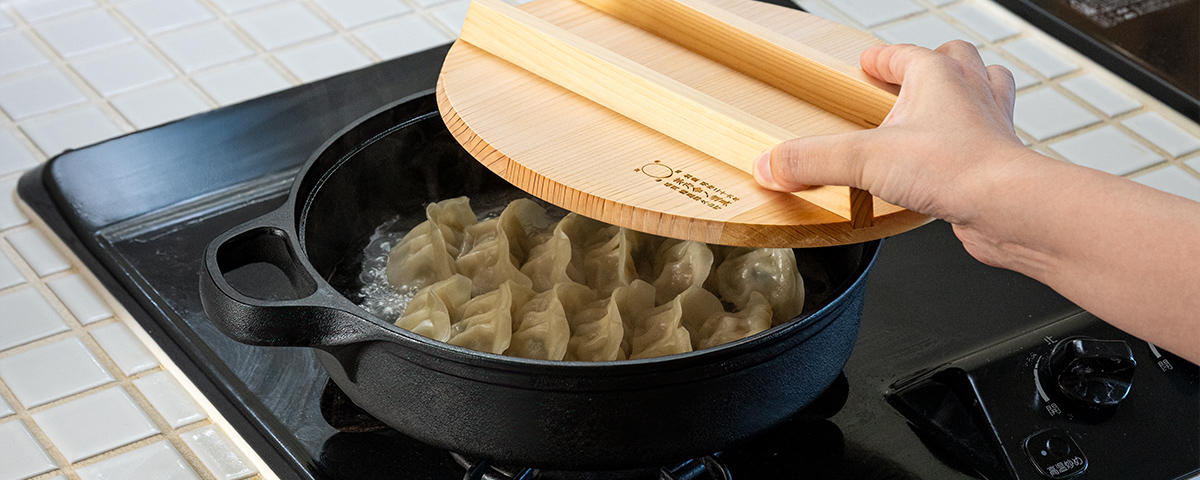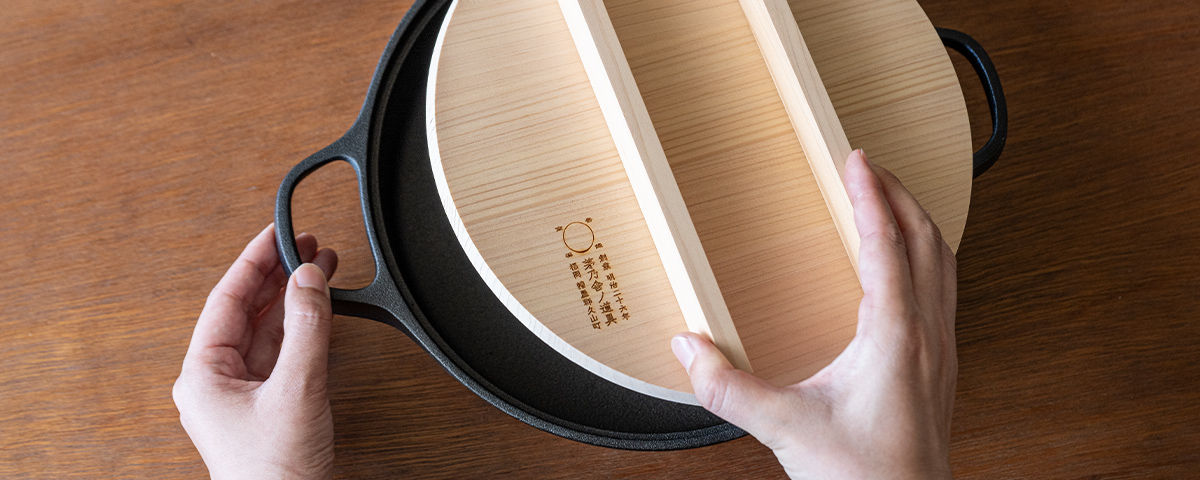 蓄熱性が高い鋳物は、じっくりと火を通す料理も得意です。茅乃舎特注の国産椹(サワラ)材の木蓋をかぶせると、対流熱を閉じ込めつつ余分な水分を逃がす構造に。焼き物はふっくら香ばしく仕上がり、鍋料理のアク取りもかないます。