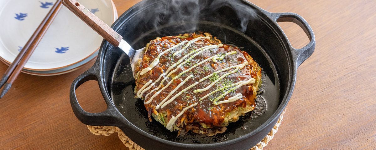 蓄熱性が高い鉄鍋を使えば、お好み焼きも表面はカリッ、中はふっくらとした焼き上がりに。鉄鍋ごと食卓に出して熱々をいただけます。またステーキやハンバーグも上手に焼けて、いつものおかずがお店の雰囲気で味わえます。