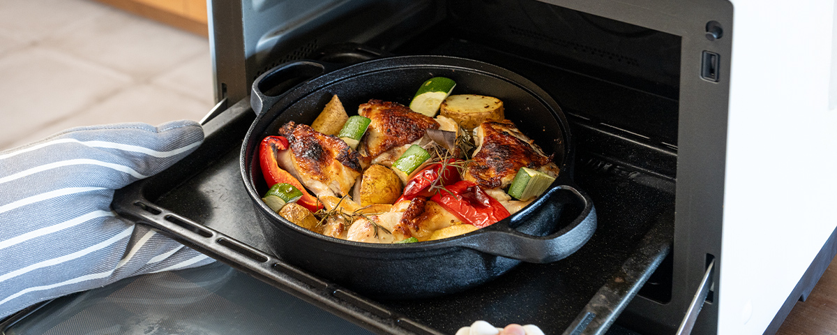 取っ手も鋳物製なので、オーブン料理にもそのまま使えます。肉と季節の野菜を一緒にローストするだけで、立派なおもてなし料理の完成です。