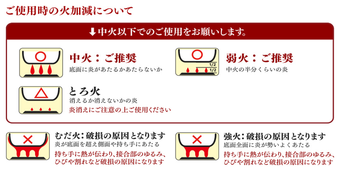 ■加熱をする際は「弱火」から始め、「中火」以下でご使用ください。