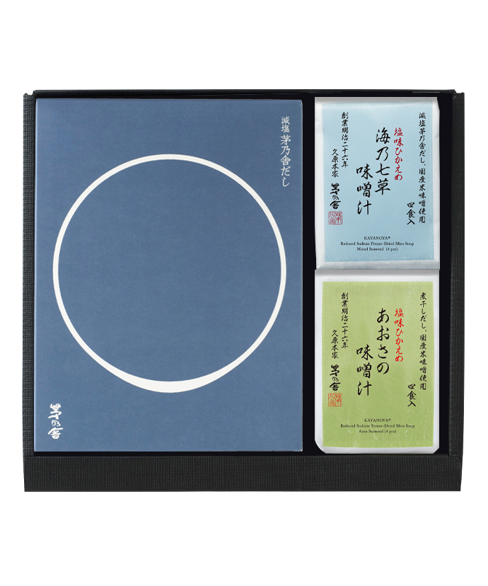 塩味を控えたお食事を好まれる方へ、減塩茅乃舎だしと塩味ひかえめ味噌汁2種をセットにしました。