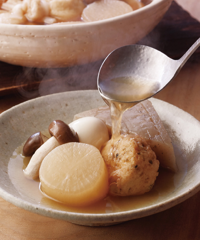 - ご家庭でも簡単においしく仕上がる「3段階の調味」のだしとつゆです。だしは、鰹が華やかに香り立つおでんのための特製だし。具材の芯まで味が染みたおでんは絶品です。