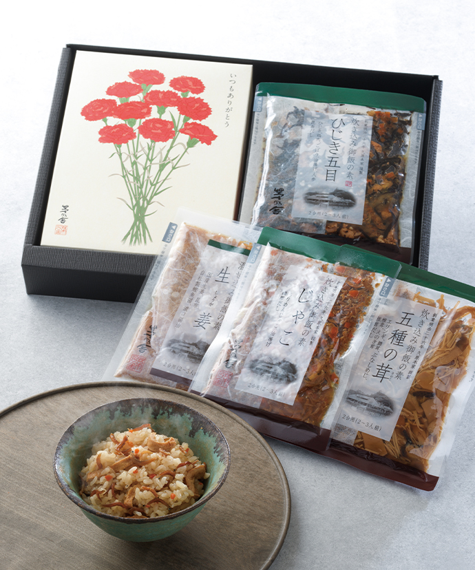- 後味すっきりと、生姜の風味が豊かな混ぜ込み御飯です。基本の味つけは昆布のだしで。自社製鰹魚醤、濃口醤油で上品に仕上げました。爽やかな余韻をお楽しみいただけます。