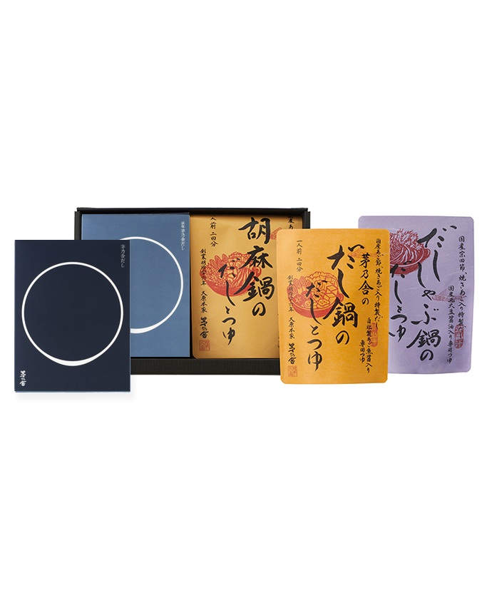 贈答箱入 茅乃舎だし・減塩茅乃舎だし・鍋3種(だし鍋・胡麻鍋・だししゃぶ鍋)ギフト