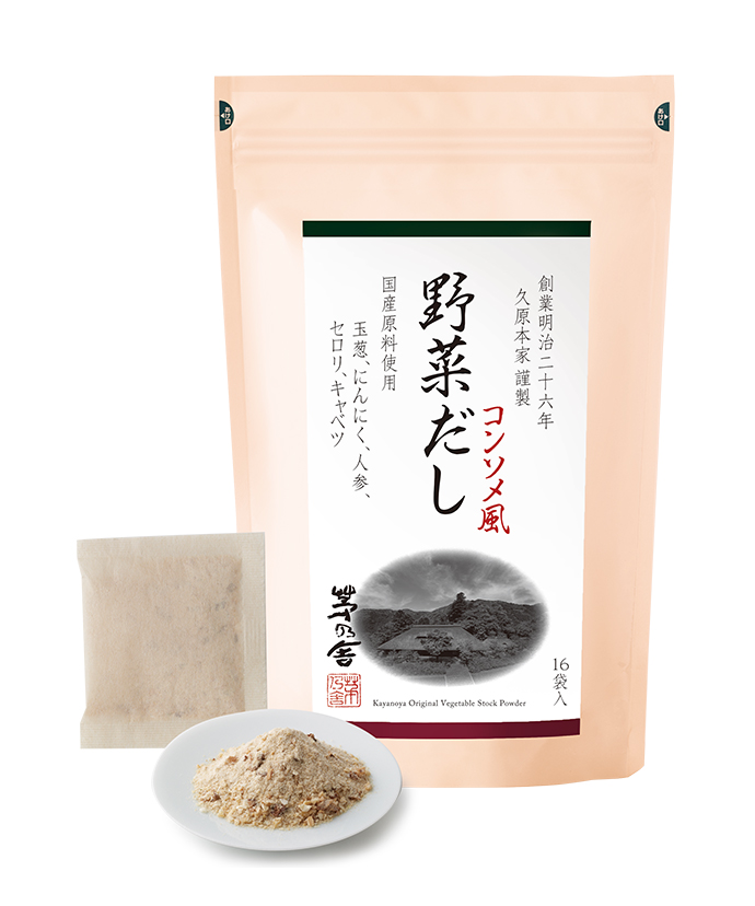 茅乃舎だし:風味原料[かつお節(国内製造)、いわし煮干しエキスパウダー、焼きあご、うるめいわし節、昆布]、でん粉分解物、酵母エキス、食塩、粉末しょうゆ、発酵調味料、(一部に小麦・大豆を含む)