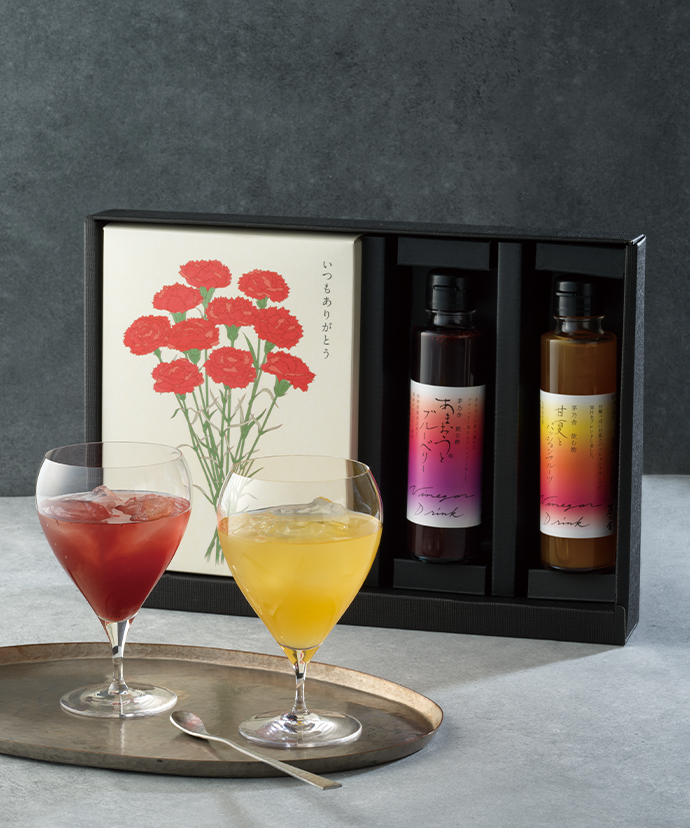 カーネーション柄の母の日限定箱入りの「茅乃舎だし」と、母の日限定飲む酢2種(あまおうとブルーベリー・甘夏とパッションフルーツ)のセットです。