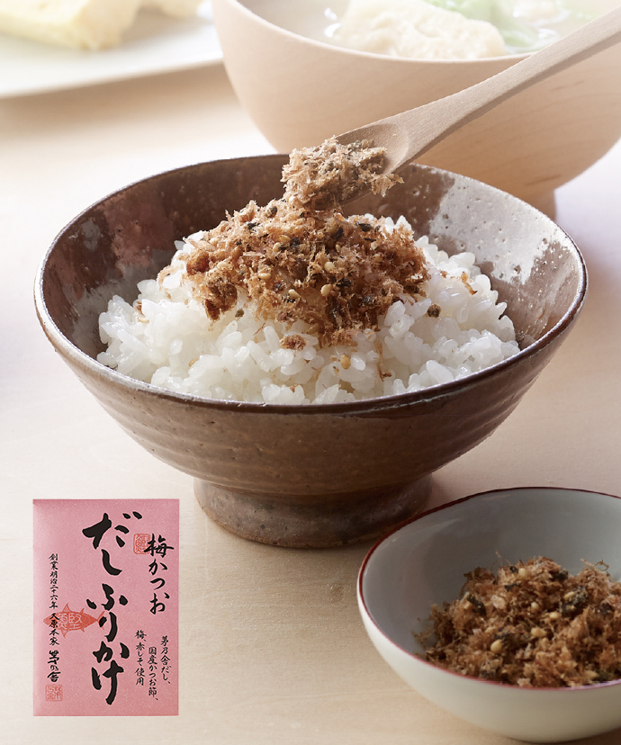 国産の鰹節に「茅乃舎だし」のうまみを含ませた。しっとり食感のふりかけ。刻み梅と赤しそで、さっぱり、風味豊かに。