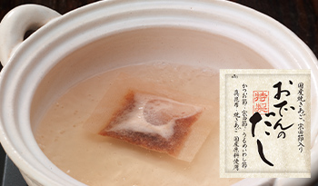 かつお節、宗田節、うるめいわし節、真昆布、焼きあごなどをバランスよく合わせた、おでんによく合う「特製だし」。しっかり味を染み込ませます。