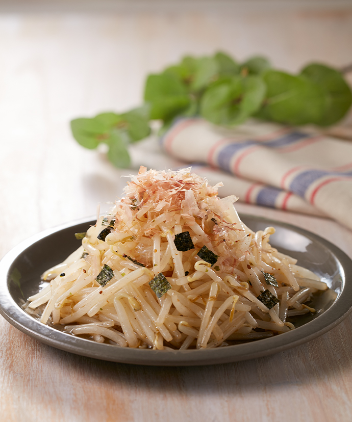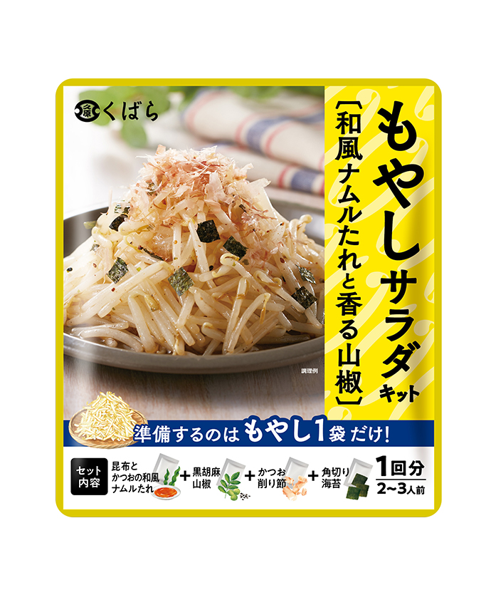 昆布とかつおの和風たれに、かつお削り節、角切り海苔、黒胡麻山椒をセットにしました。電子レンジで温めたもやしと和えるだけで、山椒の風味豊かな和風のもやしサラダをお楽しみいただけます。