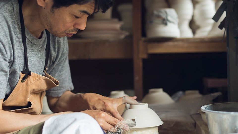 直営店裏にある工房は開放感があって、風がよく通る。奥に進むと、作業中の今村肇さん。飯碗の裏側の、高台とよばれる部分をオリジナルの削りカンナを使って、形を整えている。今村さんは、350年の歴史を持つ陶悦窯13代目の次男として生まれ、陶悦窯で修行を積んで独立。大治将典さんというデザイナーにデザインを依頼して、JICONを立ち上げた。もともと、この場所は母方の実家の建物で、今村さんの奥さんの麻希さんが、アンテナショップを営んでいた。陶悦窯で働きながら、麻希さんの姿に影響を受けて独立を決意したという今村さん。2012年のことだった。