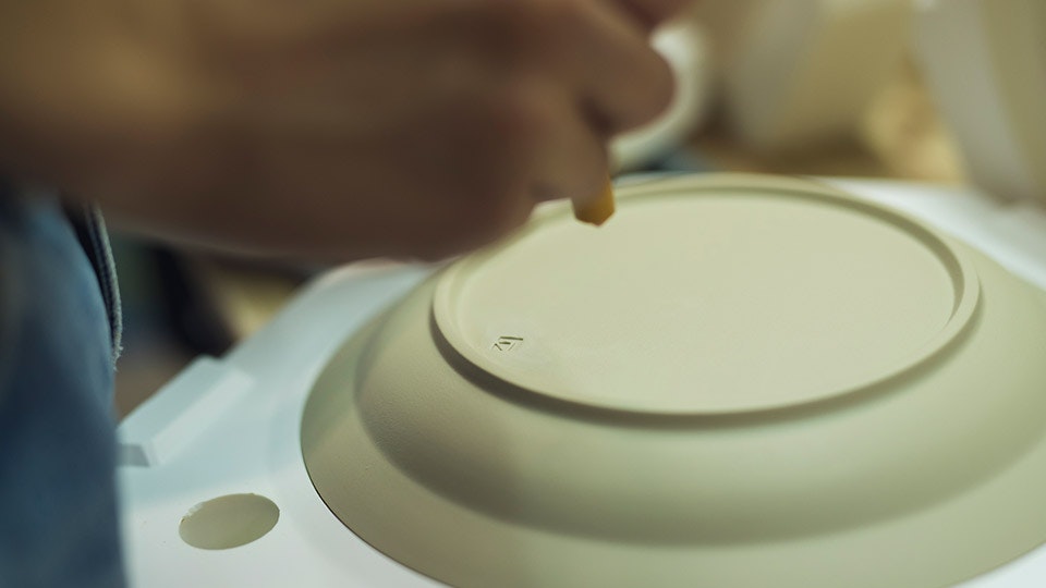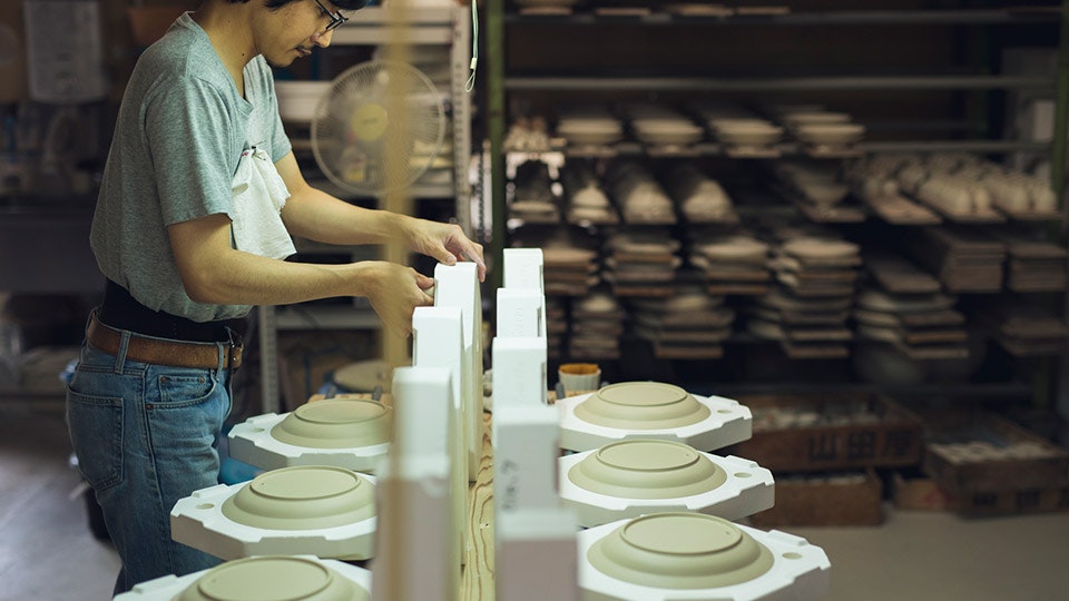 この日は、若い職人さんが、圧力鋳込みを行なっていた。白い石膏型をいくつも積み重ね、そこに、静かに粘土を流し込んでいく。石膏型は、繰り返し使うものだが、今村さんはこれを100回ほどしか使わないと決めている。型が古くなれば、器のフォルムが甘くなるからだ。石膏型から出した粘土を乾燥させ、電気窯で9時間焼けば、ほんのり薄ピンク色の素焼き生地が焼きあがる。