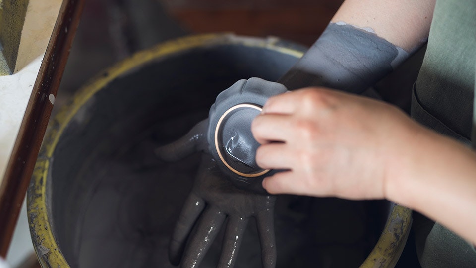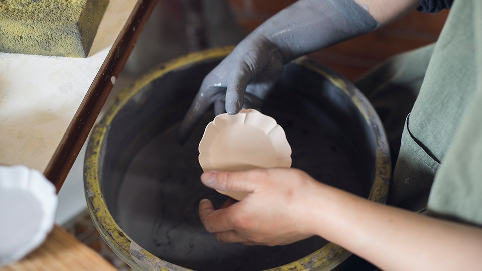 作業は、生地作りから始まる。生地は、「圧力鋳込み」「水ゴテ」「排泥(はいでい)鋳込み」という3 通りの方法で作られ、それぞれ形によって向き不向きがある。圧力鋳込みは、平らな皿を作る際に、水ゴテはろくろを使うやり方で、高さがあるコップ類に用いる。排泥鋳込みは、花瓶やピッチャーなどに適している。