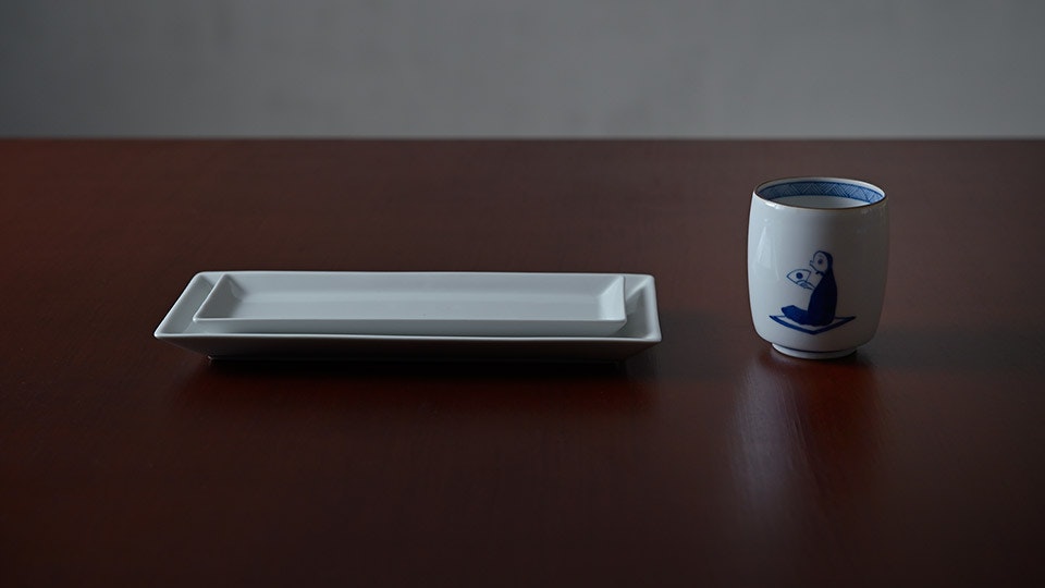2枚の平皿と湯呑みは、輪島キリモトと同じ石川県にある上出長右衛門窯の商品。上出長右衛門窯は、新しい発想で九谷焼を刷新する窯元。湯呑の絵付けもユニークだ。焼き魚を乗せるなら、漆器よりも磁気かなと求めたのがこの平皿だとか。細長い形が使いやすく、「干物や、小さめの焼き魚に使っています」と奥様。この平皿は本来、絵付けがされている商品だが、絵付け前のものを購入。器は料理の脇役と考えて、基本的には模様がないものを選ぶ。料理が映える、白い器が好みだそうだ。