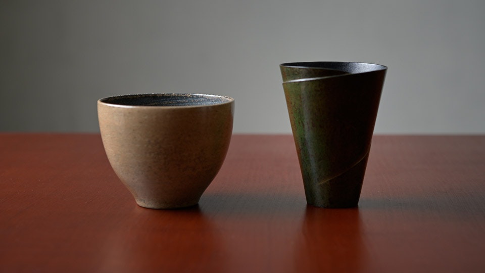 左は、白い漆とグレーの漆を重ね独特の表情をもたらしたカップは、蒔地のままの、ざらざらとした土の断面のような質感が特徴。漆器のアクセサリーと同じく、加藤修央さんの作品。右は、木を使用せず、麻の布を漆で貼り重ねて固く仕上げる乾漆技法の作家、横山美穂さんの作品。「ちょっとやさしい表情が魅力」と奥様。分業制で、124もの工程を経て作られる輪島塗。繁忙期には、輪島キリモトの仕事を横山さんにお願いすることもあるという。