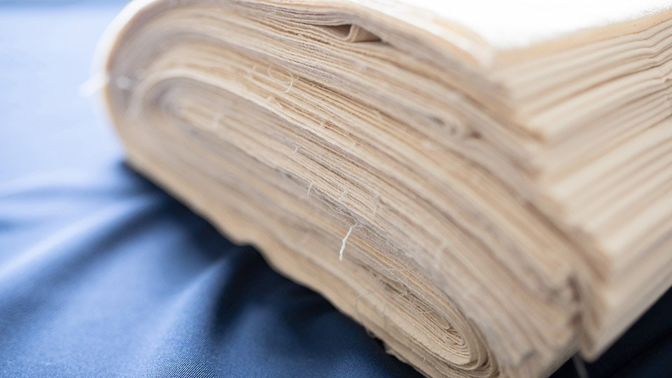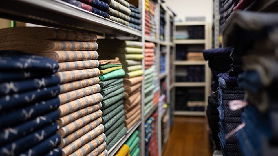 毎日使っていただきたいから、丈夫で大きな瓶でもすっぽり入り、扱いやすいものがいい。また「お買い物袋」をつくる工程も、資源やモノを大切にする心と共にありたい。それらをかなえるべく、ご相談した先は、久留米絣の織元、坂田織物さんだ。反物である久留米絣の特長をいかせば、生地の両はじを断裁せずに縫製する「ミミ残し」の製法で、生地のロスをできるかぎり抑えることができるという。また、柄物が多い久留米絣のなかで、あえて「無垢」の生地を選んだのにも意味があることも、この後、ご紹介していきたい。丈夫で長持ちするモノと永く暮らす。人とモノのお付き合いの本質のような「お買い物袋」がうまれた現場、坂田織物の工場を訪ねた。