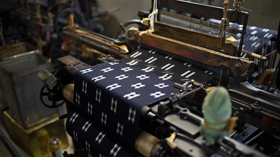 朝の8時半。高らかな音を響かせながら、「シャトル織機」と呼ばれる久留米絣の織り機が、今日の仕事をはじめていた。毎日のことだから職人さんたちにとって耳栓は必需品だ。でも、ただワクワクと製作の現場を覗く私たちの耳にとっては、なぜか心をゆだねたくなる音だ。