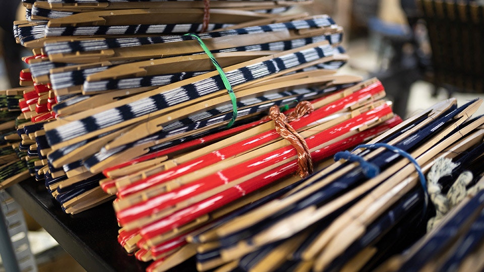 例えば、廃業する工場があると聞けば織機を引き取り、保管しておく。年季の入った織機が故障したときのための交換用の部品を確保するのだ。また、現在は機械織りが専門ではあるが、藍染めと手織りの文化も引き継ぎたいと、15年ほど前に藍染めの技術を取得し、専用工房も増設した。重要無形文化財(久留米絣)の技術伝承者の資格も取得したほどだ。残ったくくり糸を再利用する「TUGU」プロジェクトやニューヨークなど海外で絣を広めるプロジェクトにも取り組む。職人でありプロデューサーであり、営業マン。深刻な問題を横目に、闊達に飛び回るお二人に、久留米絣への希望を感じる。
