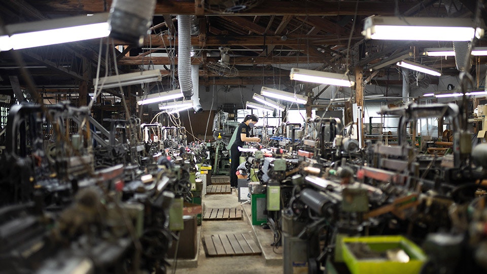 「すごいスピードで動いているように見えるでしょう? でもね、今どきのデジタル織機と比べたら、とても遅いんですよ」とは坂田織物の代表取締役・坂田和生さん。一日中フルスピードで織り上げてもやっと一反。「ゆっくりゆっくり織るからでしょうか、糸にストレスがかからないんですよ」と企画・営業部長の由香理さんが続けて教えてくれた。