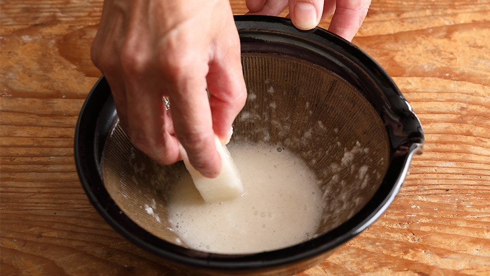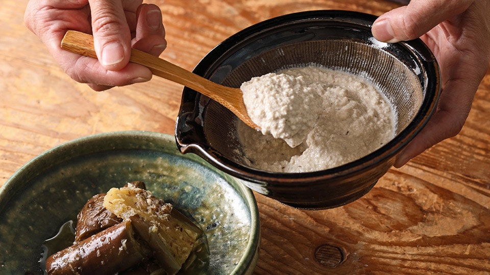 豆腐を口当たり良く潰すことができるのは、擂鉢だからこそ。茄子の煮汁を少しずつ加えて、お好みのなめらかさになるよう調節します。