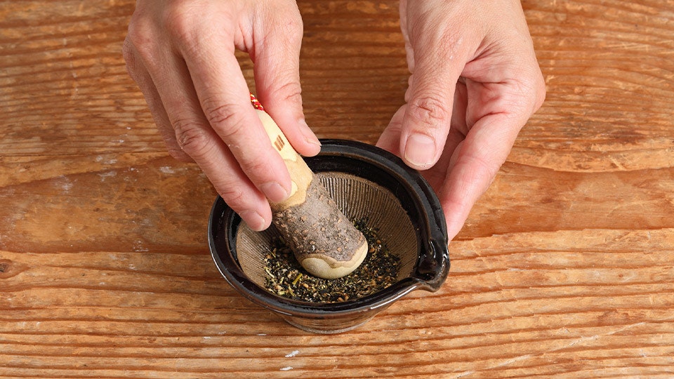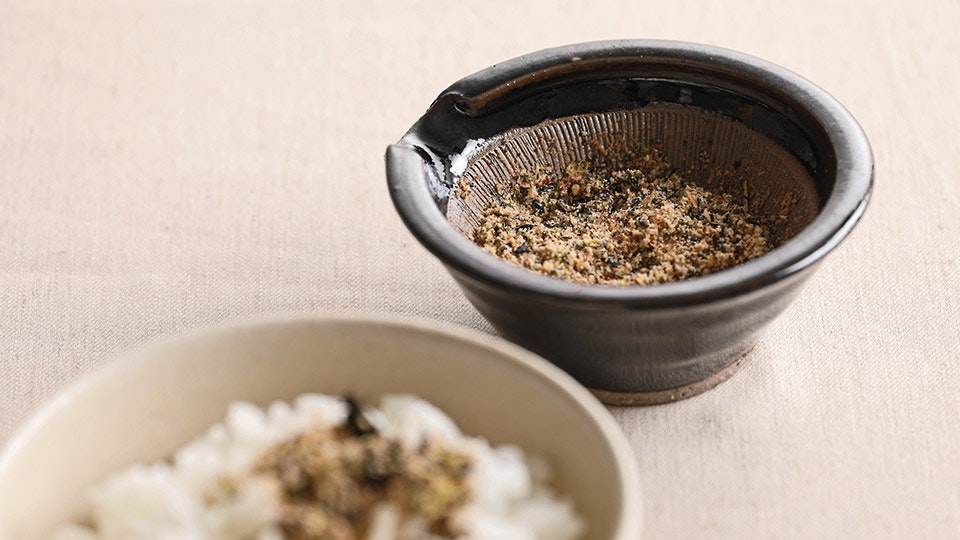 擂鉢があれば、ふりかけづくりも簡単。乾燥わかめ、胡麻、緑茶は煎ってからすることで香りを存分に引き出します。