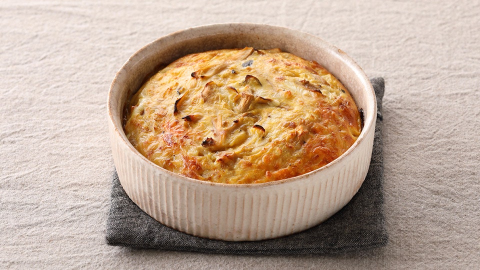 すり潰した長芋でふわふわに仕上げたキッシュ。「野菜だし」のやさしいうまみに、チーズと生クリームのコクを加えました。