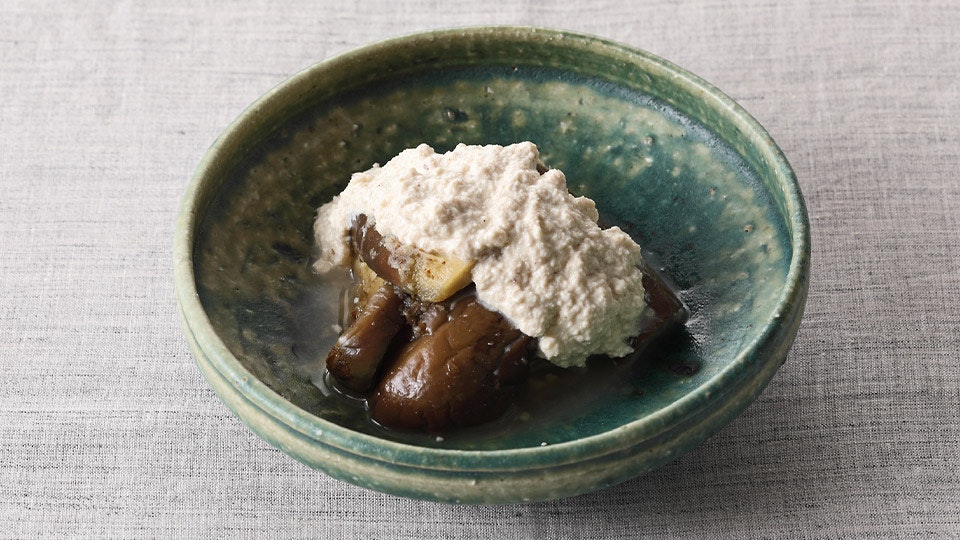 だしのうまみをたっぷりと含ませた茄子に、なめらかな豆腐ソースをかけていただきます。手軽ながらも料亭のような仕上がりは、おもてなしの席にもぴったりです。
