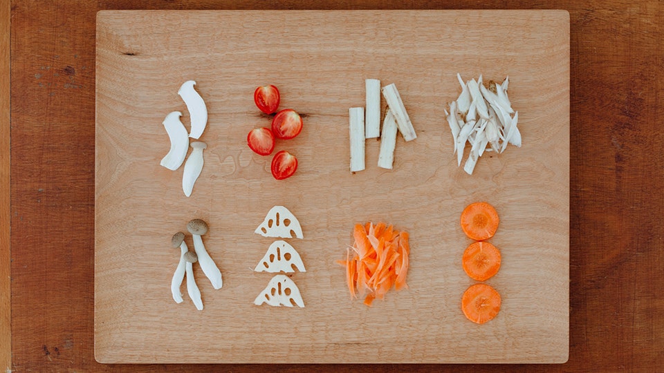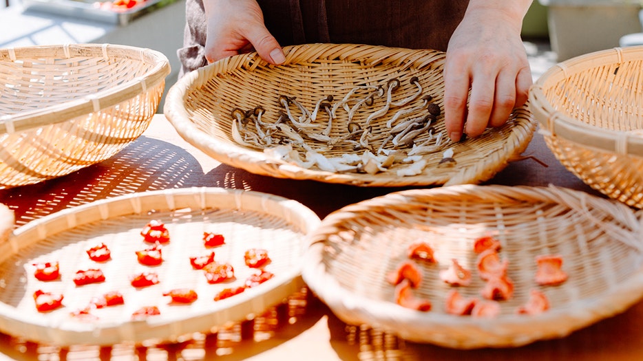必要な道具はカゴやネットだけ。用途に応じて野菜をカットします。きのこは石づきをカットして、小房に分けるかスライスして。葉物は一枚ずつ。根菜は輪切りや拍子木切りなど。薄くスライスしたり、ささがきにすると早く干し上がります。