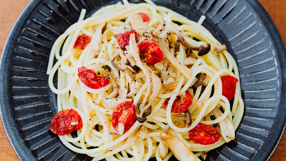 戻し汁で味が出るので、味付けは最小限で。濃厚なトマトの甘みが引き立つオイルパスタです。