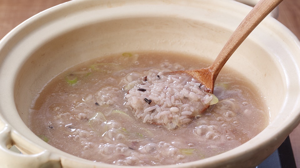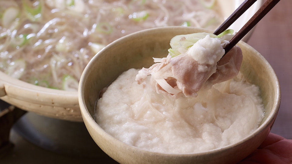 岡部:しゃぶしゃぶして肉のうまみをたっぷり含んだ鍋つゆで、〆の雑炊をどうぞ。十穀と餅米を合わせた「十穀おこわ」をお付けしています。煮詰め具合は、お好みで。鍋つゆの汁けが残るくらいにさらりと煮込んで硬めでいただくと上品です。さらに煮込んで、米粒の芯までだしのうまみを浸み込ませてとろみをつけて食べるのもおいしいです。かけたり、ピリリとした辛さの薬味「生七味」を添えたり、さまざまな味わいでお楽しみください。