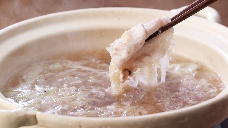 岡部:しっとりとしたうまみのある黒豚は、やはりおいしい。切り方は、おだしの風味を一番含みやすい厚さにして、最後までおいしく味わっていただけるようにこだわりました。鍋はぐらぐら煮たたせない方がおいしく仕上がります。