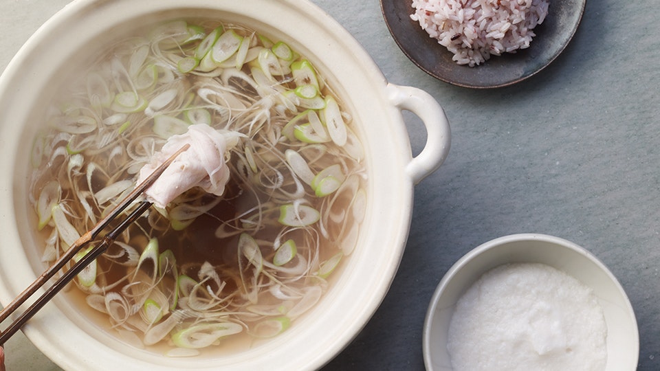 岡部:実は、十穀鍋は「御料理 茅乃舎」で開店当時から人気がある名物の鍋なんです。この鍋を目当てに遠方からもお客様がいらっしゃるほど。今回の「冬の十穀鍋」は、“十穀の香りを生かしたおだし”という考えを継承しつつ、ご家庭で楽しみやすいよう、食べ方や味つけを変えました。一番の特徴である十穀の香りが生きたスープは、私も満足がいくほど豊かに表現できたと思います。お店では具材のうまみや香りを溶け出させて鍋の味を完成させるのですが、それはご家庭では難しい。そこで手軽に楽しめるしゃぶしゃぶにし、ご家庭でもおいしく味わっていただける十穀鍋つゆを新たに考案しました。