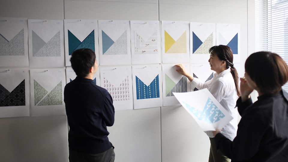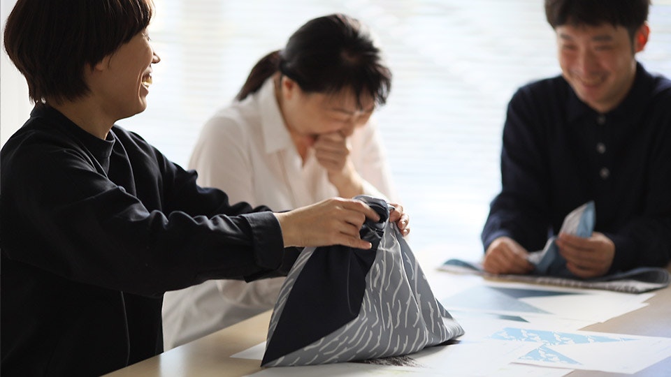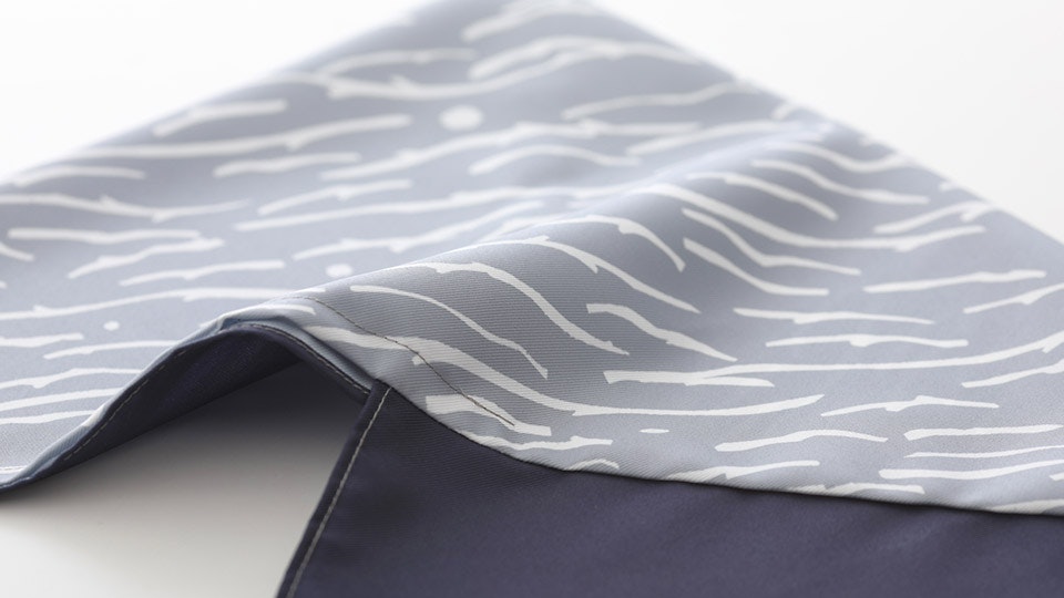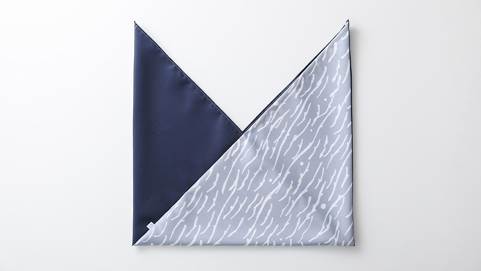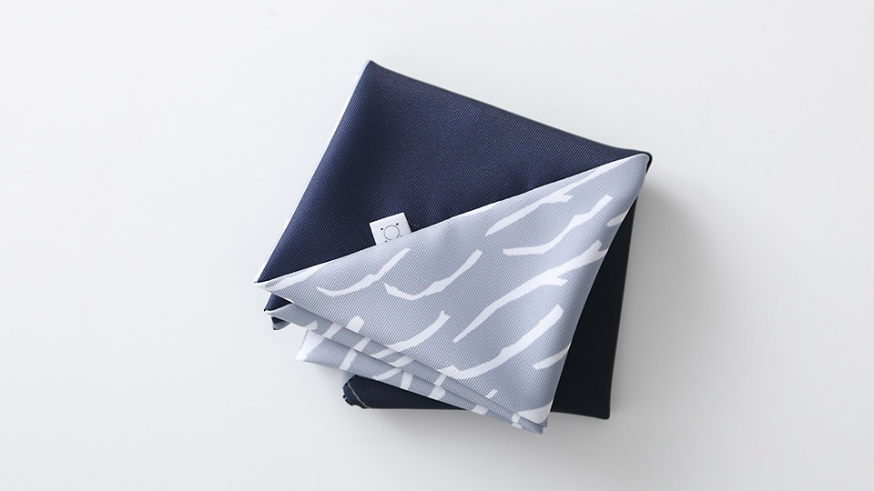 ちなみに、元々平野が提案したカラーリングは、淡い水色無地×グレーの組み合わせ。そのカラーリングは社内でも好評でしたが、男性も気軽に使えるものにしたい、よそ行きの恰好にも合うものがいいと検討を重ねるうちに、無地部分を紺色とすることに。数種類の紺色に絞り、ほんのり赤みを感じる紺色に落ち着きました。