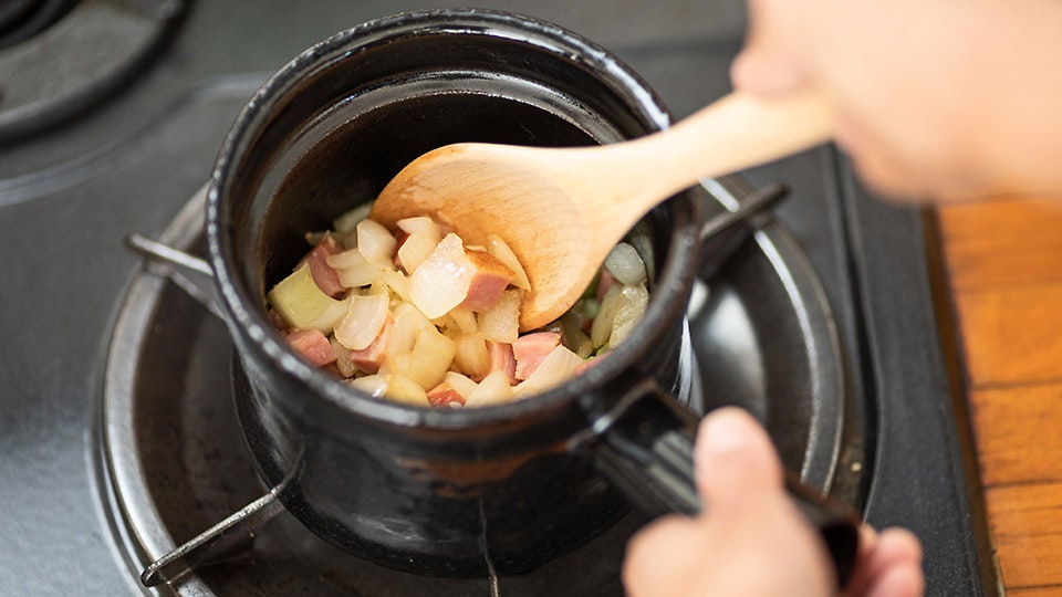 野菜は弱火でじっくり炒めて、水けを飛ばしてから水とだしを加えましょう。