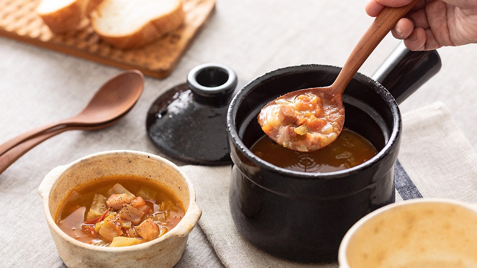 「野菜だし」で野菜がたっぷり採れるミネストローネを。土鍋で野菜を炒められるのも片手土鍋の魅力。土鍋ながら安定感があります。